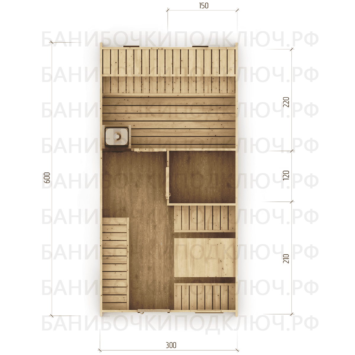 комната отдыха – 200х300, парная 180х220, мойка 120х220