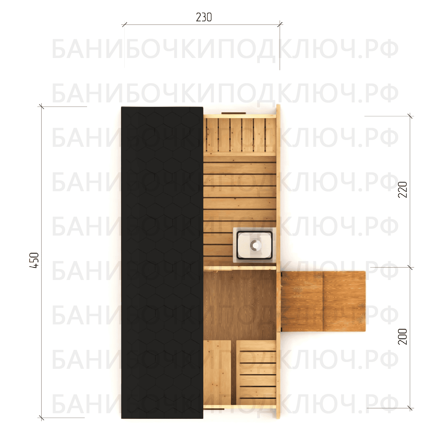 комната отдыха – 200х400, парная 250х220, мойка 150х220
